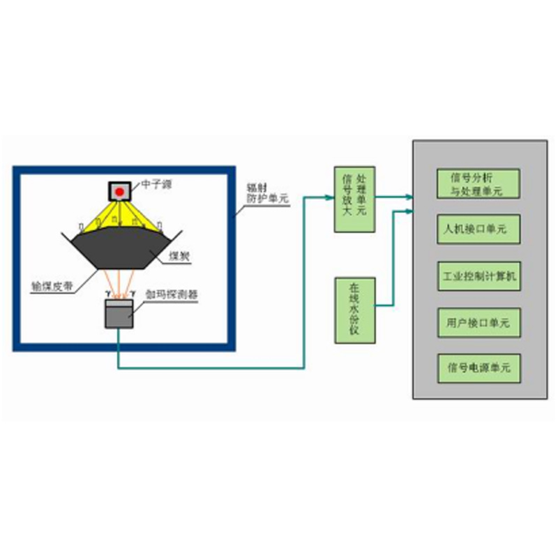 PCE系列在线煤质分析仪直接安装在输煤皮带上,中子发生器置于输煤皮带上方,探测器布置于输煤皮带的下方。进入测量段的煤流在中子照射下,部分核素与高能中子发生非弹散射反应,放射出特征γ射线。检测系统根据测到的γ射线的能量来分析物料所含元素的种类,根据测到的相应能量γ射线的峰面积来确定元素的重量百分含量。